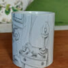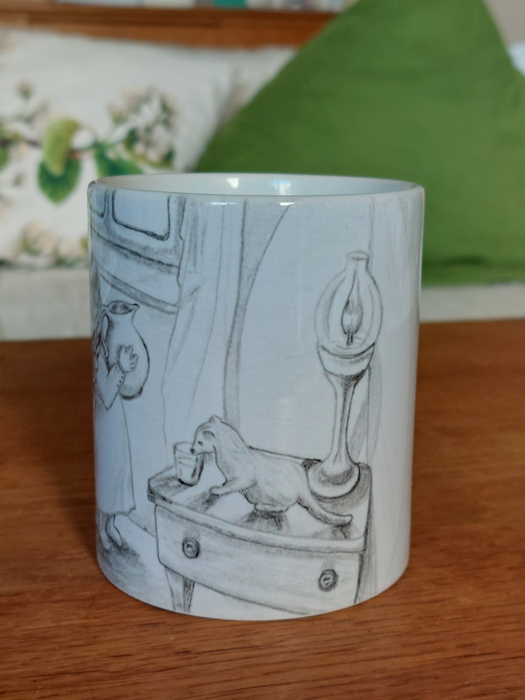 Tasse en céramique, 9,5 cm de hauteur, 8 cm de diamètre. Une partie est sans dessin du côté de la poignée.